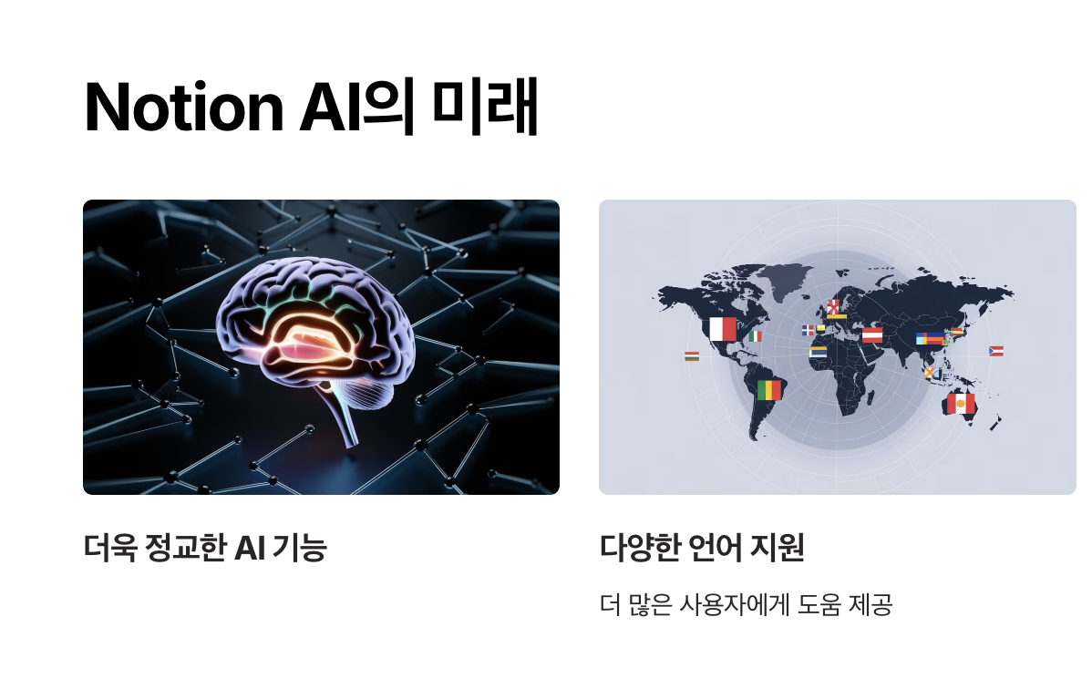 - Notion AI는 현재 영어를 중심으로 가장 강력한 기능을 제공하며, 일부 주요 언어도 지원합니다. 다만, 한국어 등 비영어권 언어에서는 번역기와 병행해 사용해야 할 수 있습니다.