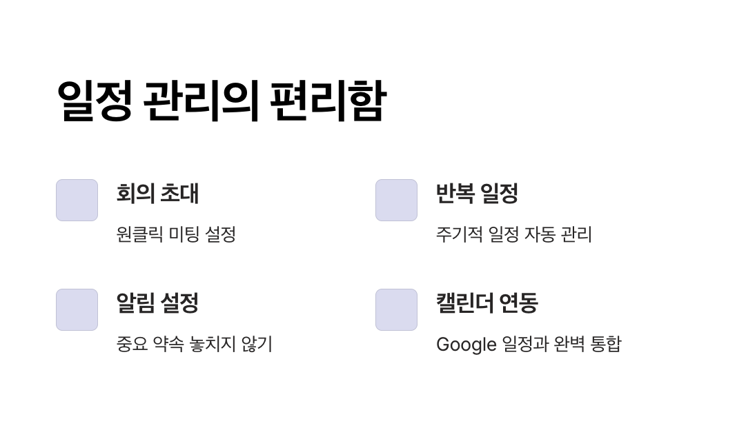 특히 회의 초대 기능은 직장인에게 필수입니다. 회의 시간을 설정하고, 참석자 이메일을 입력하면 자동으로 초대장이 전송되며, 수락 여부도 실시간으로 확인할 수 있습니다.