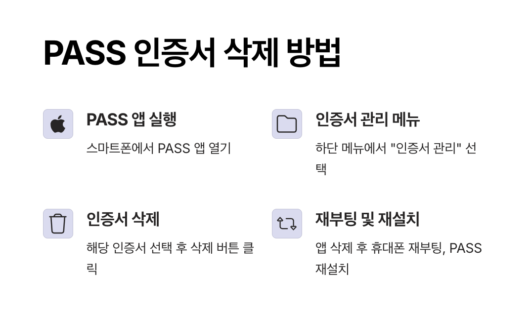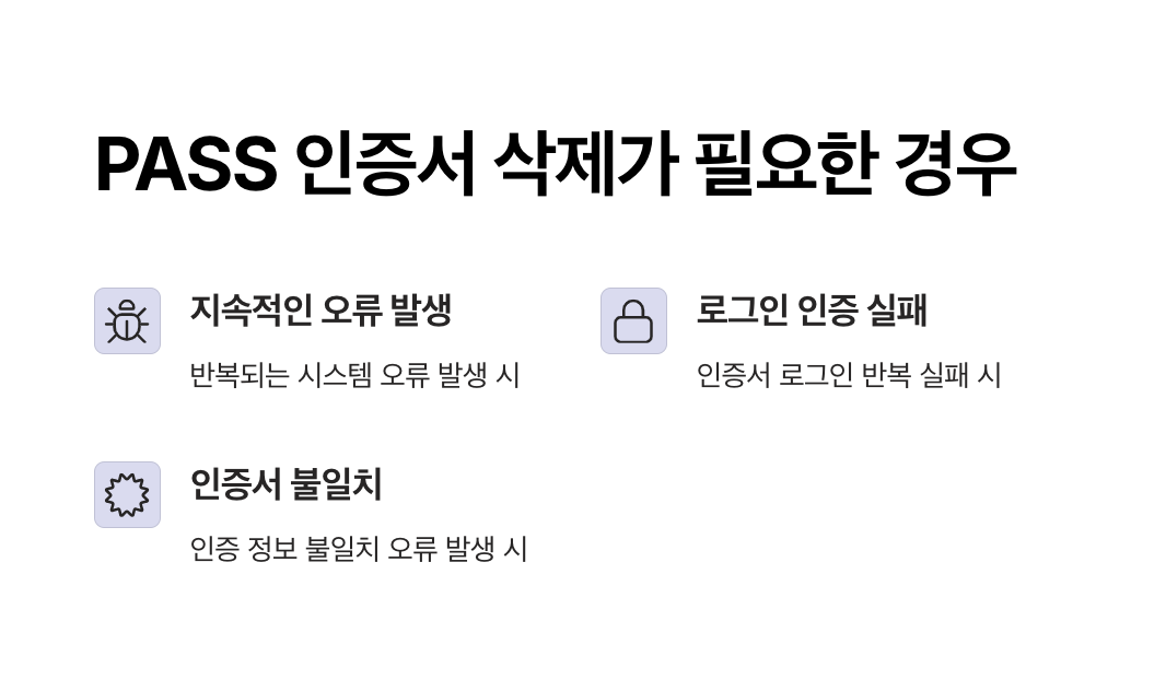 PASS 인증서 오류가 지속될 경우, 기존 인증서를 삭제하고 재설치하는 것이 가장 효과적인 해결 방법입니다. 특히 발급 오류, 로그인 오류, 인증 실패 등이 반복될 경우, 인증서를 재설치하면 대부분의 문제가 해결됩니다.