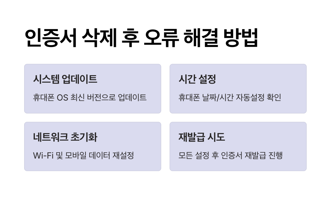 - 사용 중인 기기의 보안 설정 또는 앱 충돌 문제로 인해 인증서 발급이 정상적으로 이루어지지 않을 수 있습니다.