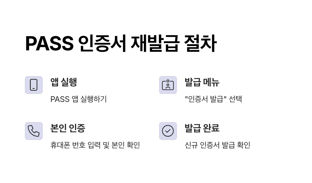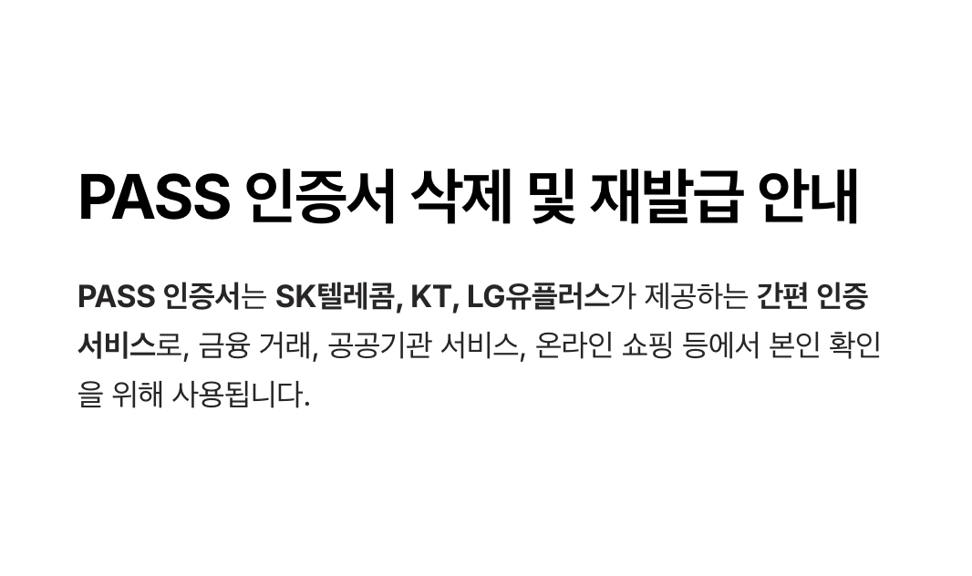 - PASS 인증서 삭제 후 반드시 동일한 휴대폰 번호로 재발급해야 합니다.