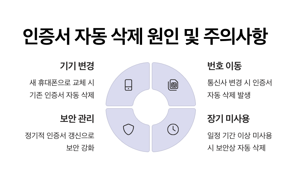 - 이동통신사 변경: 번호이동을 하거나 통신사를 변경한 경우 인증서가 자동 삭제될 수 있습니다.