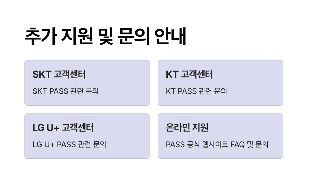 만약 위의 방법으로도 해결되지 않는다면, 각 이동통신사의 고객센터를 통해 추가 지원을 받는 것이 좋습니다. SK텔레콤, KT, LG유플러스 고객센터에 문의하거나, PASS 인증서 공식 웹사이트의 자주 묻는 질문(FAQ) 섹션을 참고하여 더 자세한 정보를 확인할 수 있습니다.