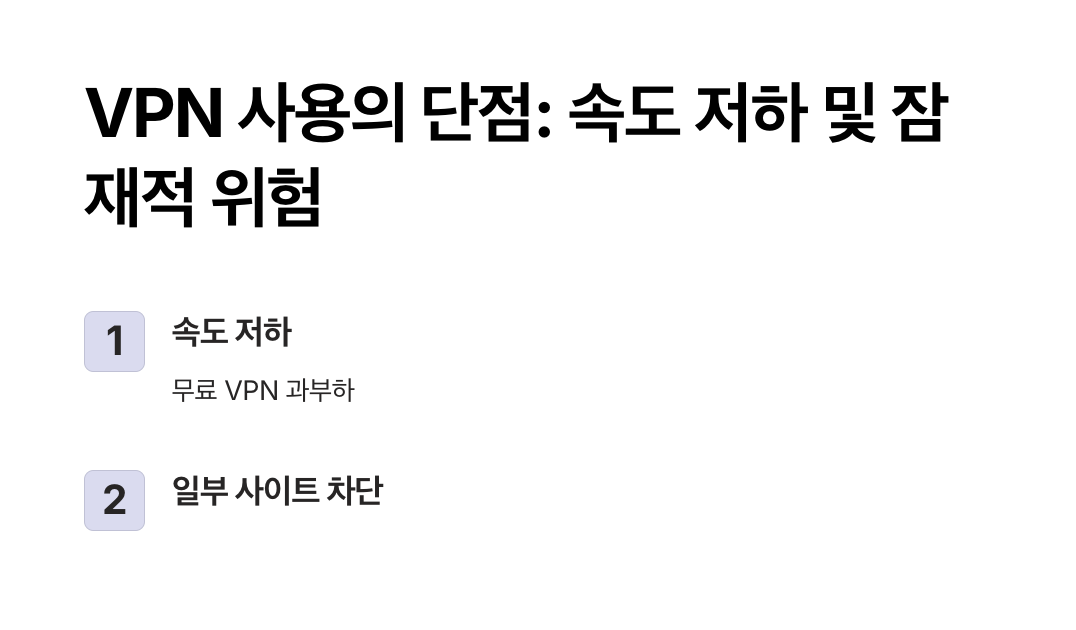 - 속도 저하: 무료 VPN은 사용자 수가 많아 속도가 느릴 수 있습니다.